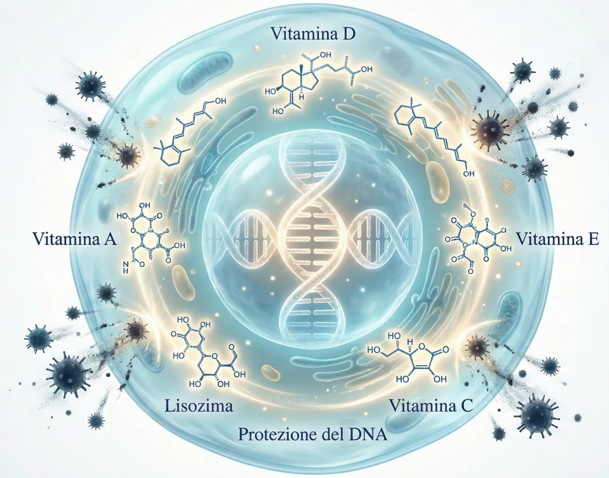 La Vitamina C è il grande amplificatore. Stimola la produzione di interferoni — le molecole che segnalano ai virus di fermarsi.